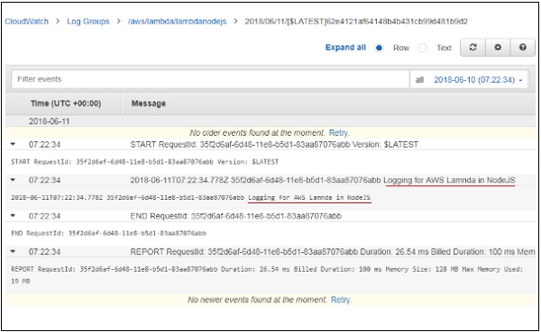 exports.handler = (event, context, callback) => { // TODO implement console.log('Logging for AWS Lamnda in NodeJS'); callback(null, 'Name of aws Lambda is=>'+context.functionName); };