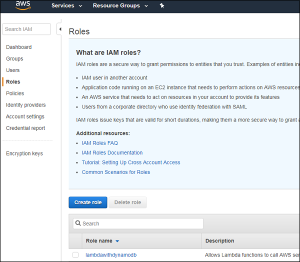 Go to IAM and select Roles from left side section as shown below −