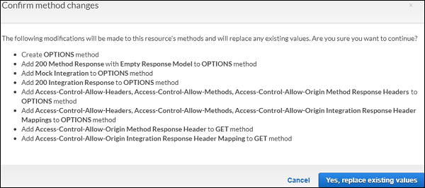 Click Yes, replace existing values button to enable it. The Enable CORS screen looks as shown below −