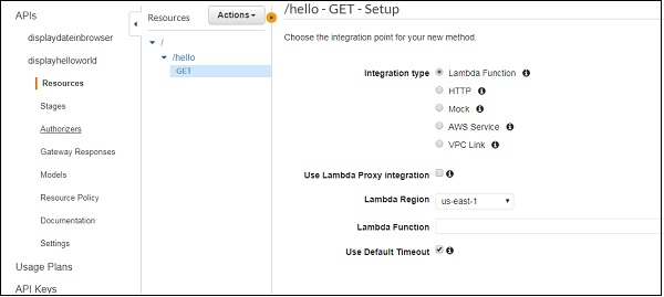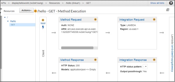 Open the API created in API Gateway displayhelloworld as shown below −
