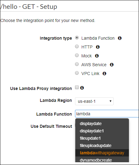 Next step is the integration which will integrate it with Lambda function. Now add the Lambda function to it as shown below −