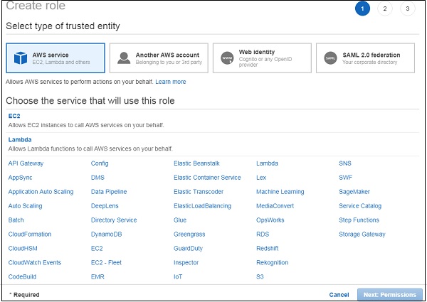 Create IAM role for permissionFrom Amazon services as shown below, select IAM for creating roles to be used by Lambda function.