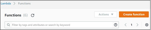 The UI screen for Lambda function is shown below. Click Create function button to proceed with creation of Lambda function.